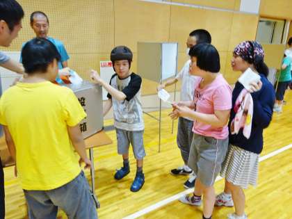 7月7日(金),生徒会本部役員選挙が本校体育館で行われました。立会演説会では立候補者がマニフェストを,応援弁士は熱い応援を,それぞれの生徒たちが北総合支援学校をみんなで作っていこう!いい学校にしよう!という思いを発表しました。今年度の選挙は立候補者が映像で演説するという新しい試みがありました。画面上で演説する立候補者が話し終わると,大きな拍手が聞こえました。投票は,上京区の選挙管理委員会から実際の選挙で使用する記載台や投票箱をお借りしたもので行いました。