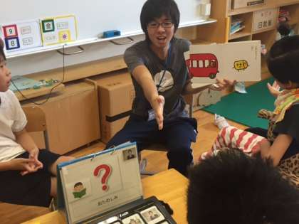 朝の会の最後の「おたのしみ」は,読み聞かせでした。本を読みながらも,ことばの学習を行っています。