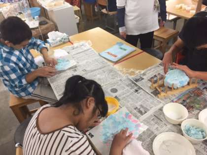 ワークスタディ「手工芸」に,今日も紅梅分教室から参加しています。一枚一枚丁寧に紙を貼りつけて,紙皿づくりに取り組んでいます。
