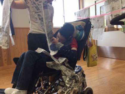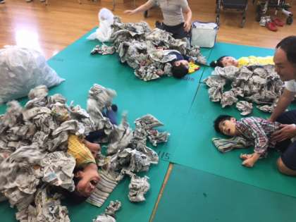 「体まるごと動かそう」ユニットでは,新聞紙ののれんをくぐったり,のれんの新聞紙をやぶったりした後,やぶった新聞紙を使って新聞紙プールを楽しみました。