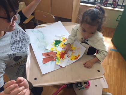 秋色の絵の具で描いた絵を切ったりちぎったりして,もみじの葉っぱをつくりました。