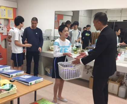 代表者から手渡されると,洗剤のさわやかな香りがただよいました。これからもみんなが気持ちよくビブスを使えます。ありがとうございました。