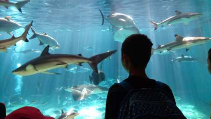 大水槽の前で,大きな魚に釘付けです❗