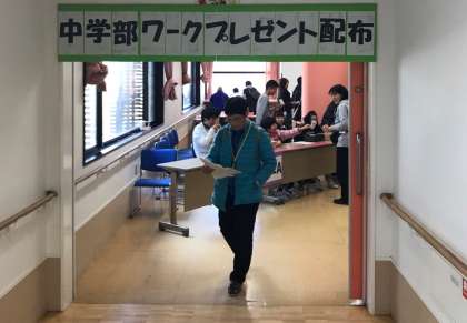 中学部ワークの製品を3階プレイエリアでプレゼント配布をしています。