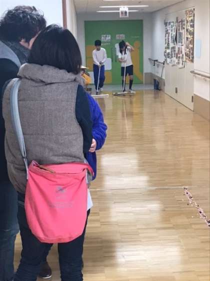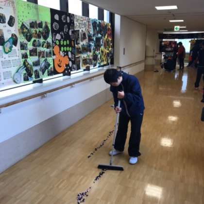 色とりどりのごみを目当てに,廊下のすみずみまで丁寧に掃いていきます。