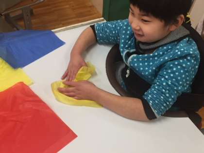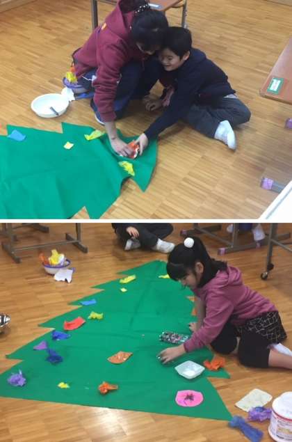 「造形あそび・クリスマスツリーを作ろう」では,クリスマスに向けて,いろいろな紙を,ちぎったり・にぎったり・はさみで切ったり・絵を描いたりして飾りを作り,ツリーにつけていきました。