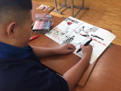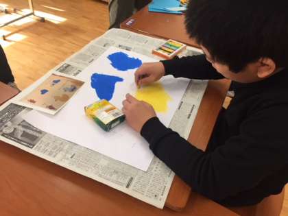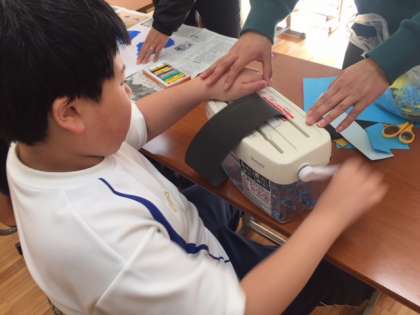 既成のお話をもとに,生徒一人一人の感性で絵に仕上げていきます。立体的な作品づくりのために,シュレッダーで素材作りも!