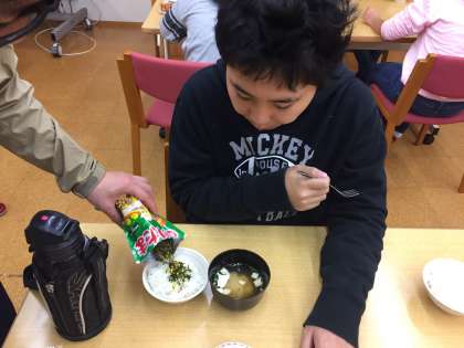 朝ごはんは,ごはん・味噌汁・ウインナー・ふりかけです。自分たちで準備をして,いただきます!