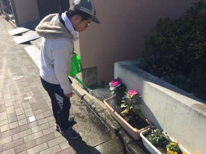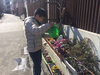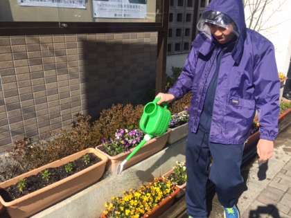 校門前のプランターに水やりをしています。きれいな花が咲き続けますように!