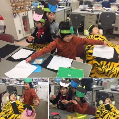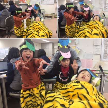 節分からは少し遅れましたが,職員室にかわいい鬼さんがやってきました。「ガッ・ワォー!!」