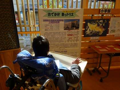 上京区総合庁舎,区民交流スペースに作品の見学に,紅梅分教室の高等部の生徒が行きました。