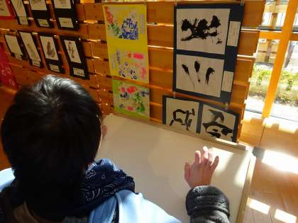 自分の作品を見付け「あった」と指を指したり,本校の友達の作品を見て,「顔の作品が,かっこいい」と感想を言ってくれました。