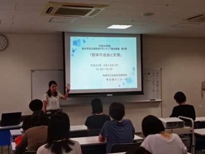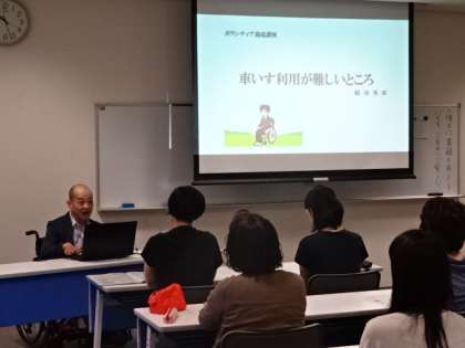 第二回目は、「肢体不自由と支援」についてや当事者の「車イス利用が難しいところ」についての話をお伺いし、実際に車イス介助の実技も行いながら学んでもらいました。受講者同士でサポートしあいつつ、和やかな雰囲気で取り組んでおられました。次回は視覚障害と聴覚障害についての講義と保護者からのお話を予定しています。