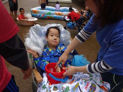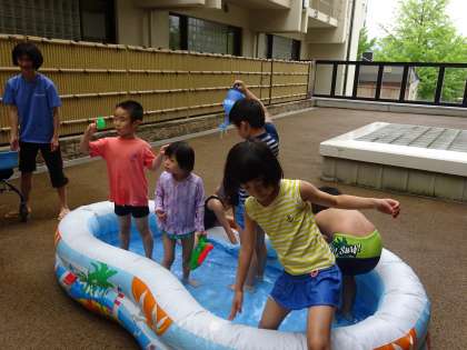大きなビニールプールにみんなで入ったり、温かいお湯に手や足をつけたり、水鉄砲やじょうろで水をかけあったり