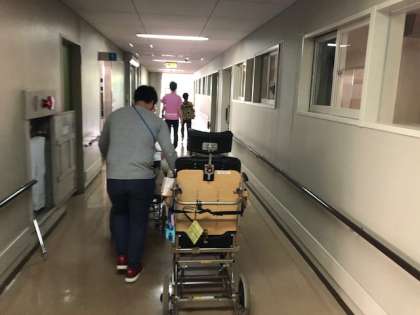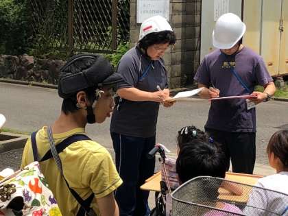 給湯室から出火した想定で,先生の指示に従い,防災頭巾をつけたり,口鼻にハンカチを当てて,校舎外まで落ち着いて避難をすることができました。