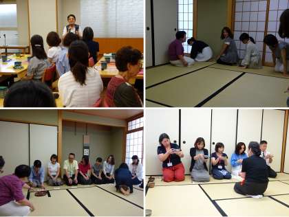 参加した20名弱の保護者や教職員は少し緊張しながらもお作法を学んでいましたが,おいしいお抹茶とお菓子をいただくと思わず笑顔がもれていました。
