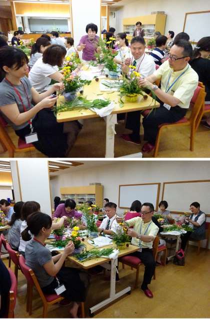 その後,メインであるフラワーアレンジメントでは女性会の方々からアドバイスをいただきながら思い思いの作品ができあがっていました。