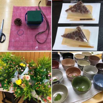 毎年,成逸地域女性会の皆さまに講師をしていただき,フラワーアレンジメントを教えていただいています。今年は特に女性会からの提案で,お点前もあわせて指導していただきました。