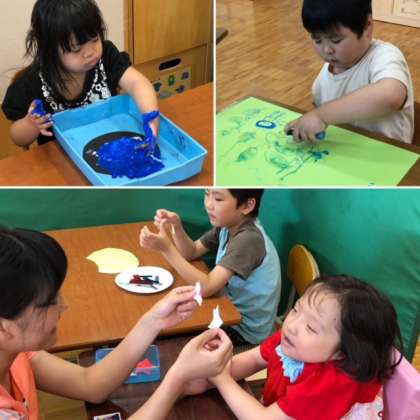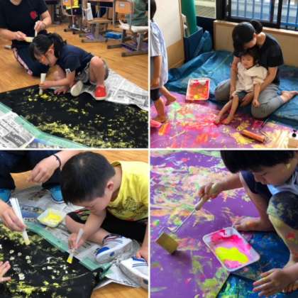 役割を分担し,天の川を描く人,笹飾りを作る人など,それぞれがいろいろな方法で楽しみながら取り組みました。