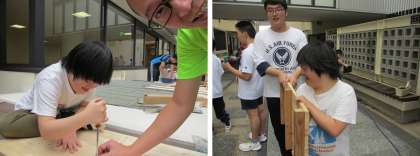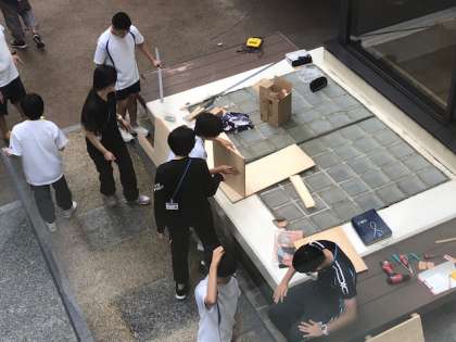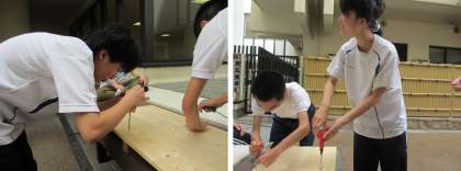 今日は,自分たちで切った木にねじ穴をあけ,電動ドライバーねじをしめていきました。完成に向けてみんなで協力して進めています。