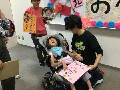 たくさんの指導者に迎えてもらい,笑顔とほっとした表情をしていました。