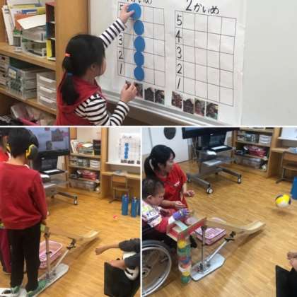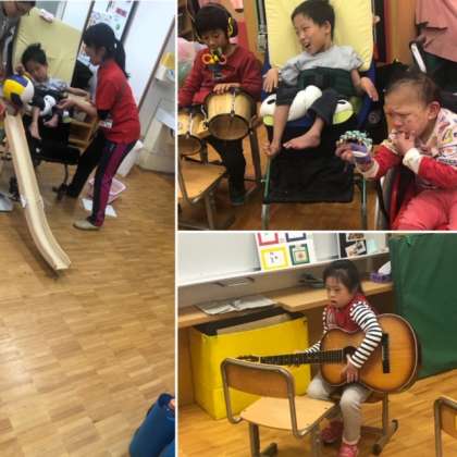 音楽に合わせて,好きな楽器を思い思いに鳴らしたり,ピンをめがけてボールを転がし,倒れた数を競いました。みんなで遊ぶと楽しいですね!