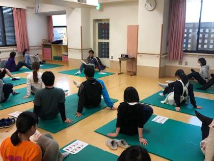 京都市健康増進センター「ヘルスピア21」の健康運動指導士 松森賢司 氏に来ていただき,教職員対象に腰痛予防教室を行いました。