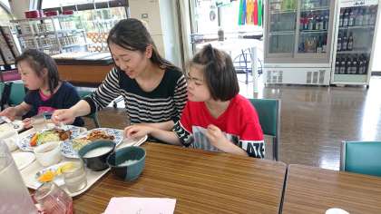 宿舎のしあわせの村あおぞらに到着し,入村式を済ませ,少しひと休みをしたら,お待ちかねの夕食タイムです。