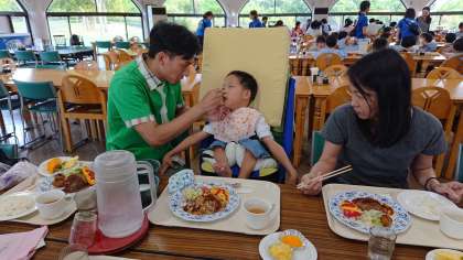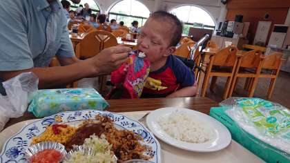 ご飯,スープに加えて,ハンバーグにカツにオムレツ,最後はオレンジやパイナップルのデザートまで,みんな本当によく食べていました。