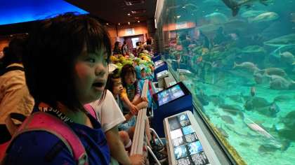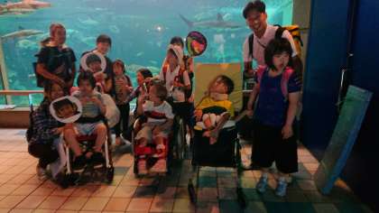 須磨水族園に到着です。あいにくの雨だったので外ではなく大水槽のまえで集合写真です。