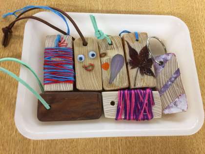 中学部のワークスタディの学習です。木片を一生懸命に磨いています。出来上がりはこの通り。とても素敵なキーホルダーです。