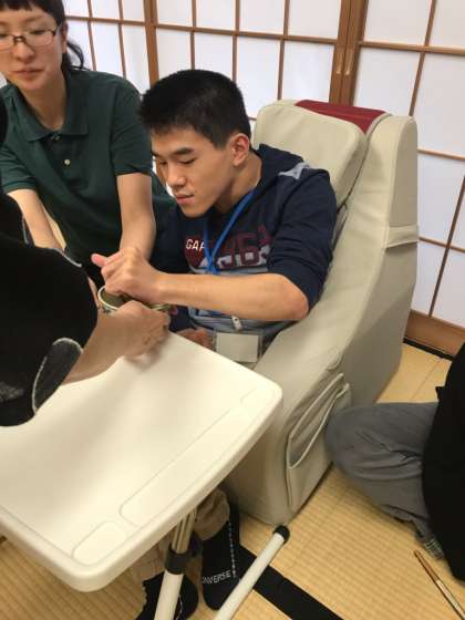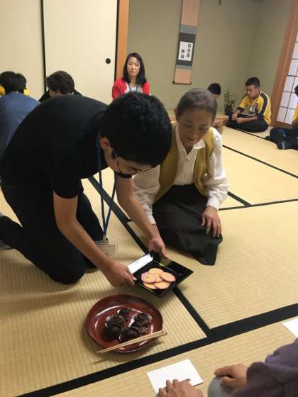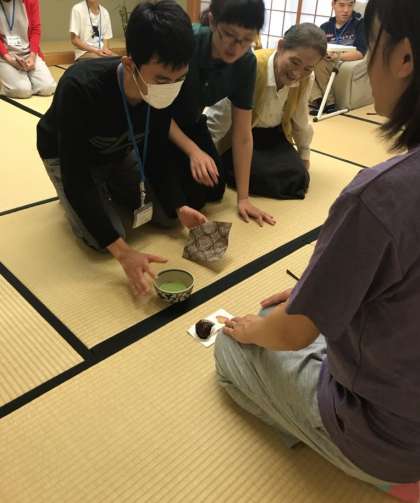 授業の後半では,自分たちでお菓子を配ったり,お茶をたてたりして,様子を見に来た教職員にお茶を振る舞いました。