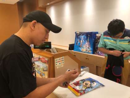 ホテルでお土産を買っています。買い忘れたものを買えて嬉しそうです。