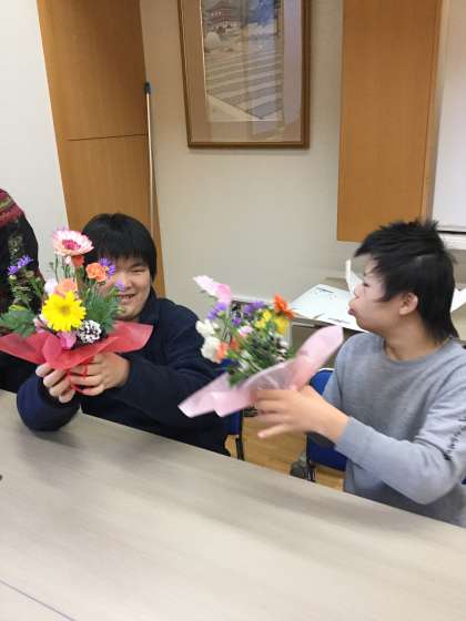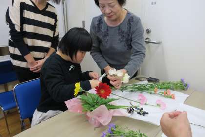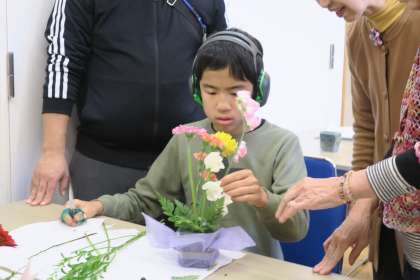 中学部1年生は初めてでしたが,女性会の方々の丁寧な手ほどきを受けながら,真剣な表情でお花を切ったり,やさしくオアシスに生けたりする様子が見られました。完成した作品を前に「きれい」と自然と笑みがこぼれ,充実した時間になりまりました。自分の作品を大切そうに持ち帰る姿も印象的でした。