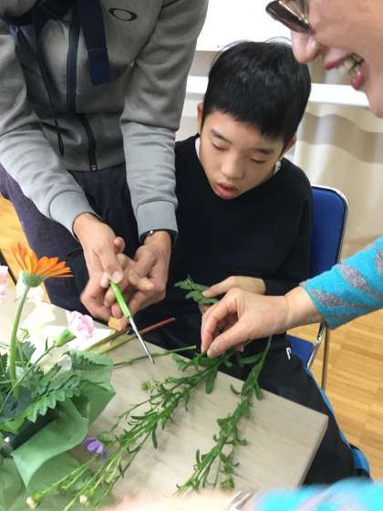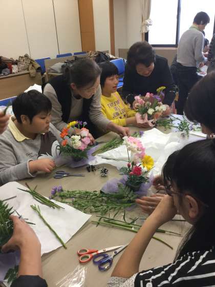 成逸女性会のみなさんから丁寧に教えていただきながら,素敵なフラワーアレンジメントができました。それぞれ真剣に取り組み,完成したときには素敵な笑顔が見られました。