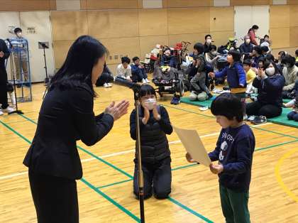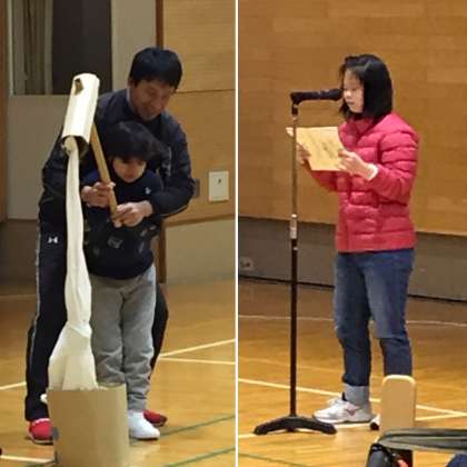 校長先生から「楽しい冬休みは過ごせましたか?初詣に行った人?初夢を見た人?」と聞かれると,子ども達は休み中のことを思い出しながら,「はーい」と返事をしたり,元気に手を挙げたりしていました。