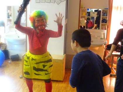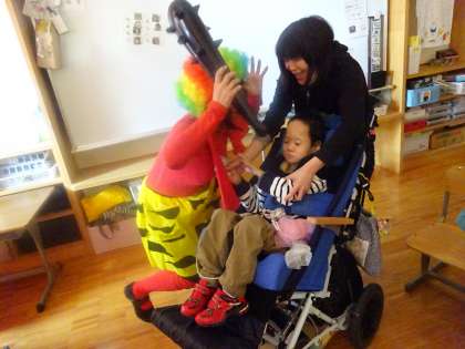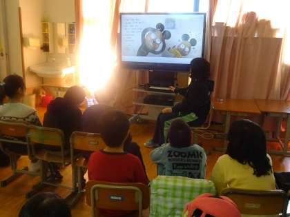 その後,大型TVで絵本の読み聞かせを聞いていたら,赤鬼が入ってきてみんなびっくり!