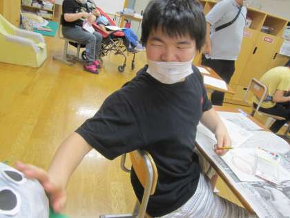 友だちに自分の魚を見せて発表しています。きれいな魚,おいしそうな魚,かわいいカニや貝,いったいどんな魚釣りになるのか楽しみです。