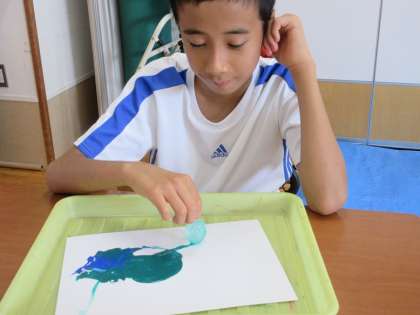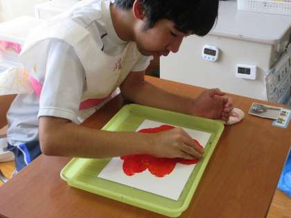 中学部の「きたきたアート」では,絵具を混ぜて色の三原色について学習したり,絵具を乗せた画用紙の上で氷を滑らせて作品を作ったりしました。冷たくつるつる滑る氷の感触を楽しみながら,思い思いに氷を画用紙の上で滑らせていました。