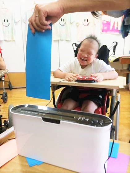 後半は,スイッチを使って,シュレッダーを動かしました。細かいパルプにたっぷり糊をつけて,画用紙に貼りました。べたっとした糊が手につくと,「うわっ」というように表情を変えて,感触を味わっていました。