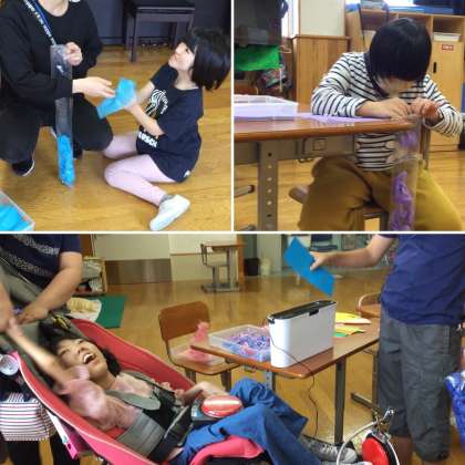 学年ライフスタディで,丸いものの代表「ドーナツ」作りをしました。好きな色のお花紙をくしゃっと丸めて傘袋に入れ,ドーナツの土台を作りました。トッピング係の生徒がスイッチとシュレッダーを操作して,ドーナツの上にふりかけるトッピングを作りました。メロン味,いちご味,ぶどう味のような色とりどりのドーナツが完成しました。自分の作ったドーナツを発表した後は,「ドドドド・ドーナツ」の歌に合わせてダンスを楽しみました。