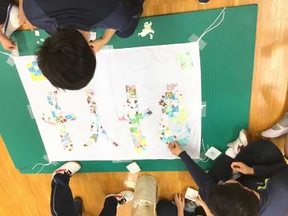 高等部1年生は,学年旗制作の真っ最中です。生徒が思い思いに制作した布を学年目標「十人十色」の文字上に貼り合わせしています。まだ制作途中ですが,完成が待ち遠しいです。完成した学年旗はあきぞらフェスタ当日の体育館に展示されますので,楽しみにしていてください。