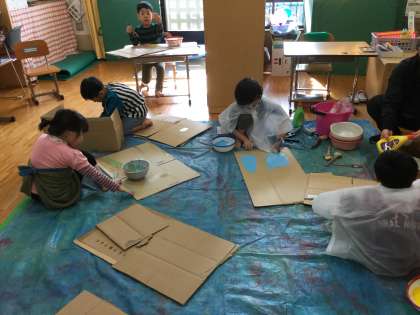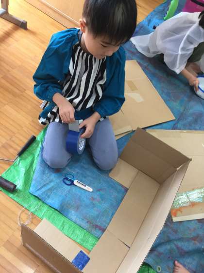 小学部1年生1,2組では,様々な大きさの段ボールを使って自由に造形活動を行いました。「家を作ろう。」とテープやはさみを使って段ボールを組み立てる児童や,様々な色の絵の具を使って段ボールいっぱいに手や刷毛で色を塗る児童など,それぞれが好きな方法で造形活動を楽しみました。