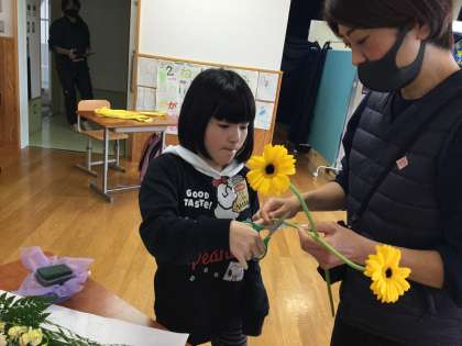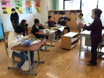 中学部では,12/1(火)に成逸地域女性会の方々に来ていただき,フラワーアレンジメントをしました。女性会の方には,茎の切り方や,バランスよく生ける方法を教わり,生徒達は花の香りも楽しみながら,思い思いに花を生けました。