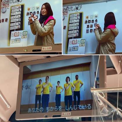 車内ではモニターを使って朝の会…いつもと違うスケジュールに子どもたちはわくわくしているようです(*^▽^*)。