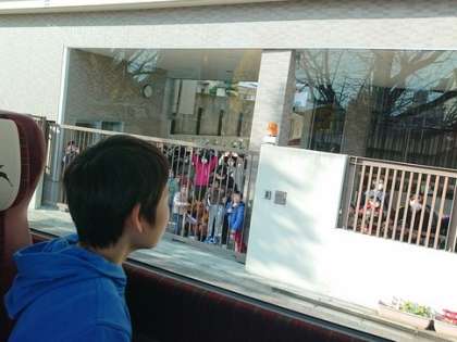 写真1枚目は,後輩や先生,バス乗務員の方々にも盛大に見送られ,学校を出発した際の様子です。