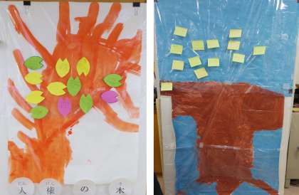 今回のテーマは「感謝の気持ちを伝えよう」。生徒がお知らせポスターや“人権の木”の土台を作成しました。“人権の木”には子どもたちや先生が書いた「ありがとう」の葉っぱが増えてきました。最終日にどんな木になっているのか楽しみです。