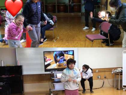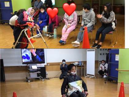 地域との交流では,手ぬぐい染めをしたり,マーブリングで和紙染めをしたりしてきました。今日はすべて自分たちで作った舞台で手ぬぐいのファッションショー!総合PDCAユニットの友だちが招待に応じて見守る中,自分で選んだBGMに合わせてランウェイを華麗に進みます。自ら元気よく車いすを動かし,トップバッターを務める生徒,ウォーカーや先生の支援を受けて力強く歩く生徒,緊張しながらも「赤と青の絵具を使って,ほっぺでもみもみして染めました」と見事に発表する生徒,すばらしい姿が見られました。ショーの終わりにはスーパーモデルたちにたくさんの拍手が贈られ,満足そうな笑顔を浮かべていました。