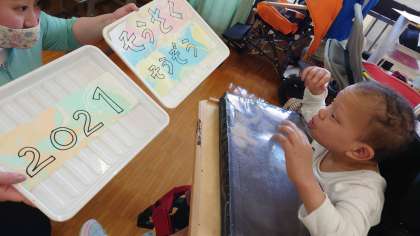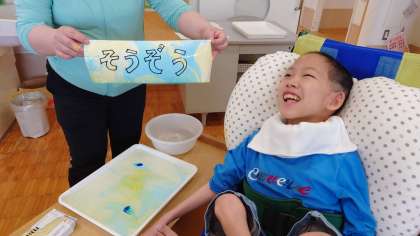 ゴールデンウィーク明け,さわやかな陽気の中で元気に活動しています。今日はみんなで中学部農園を見に行った後,今年のプランターに飾る看板作りをしました。マーブリングの絵具を使って「黄色と青を使うよ」「赤も青も黄色も使いたい!」「きれいな色に染まって嬉しい!」と意欲的に活動しました。色とりどりの看板をつけるのが楽しみです。
