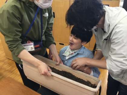 ワークスタディに1年生が合流しました。ドキドキ,緊張した表情で教室に入ってきた1年生たちも,先輩や先生の楽しい雰囲気につられて笑顔を見せてくれました。今日は土を触った後,マリーゴールドとアサガオの種まきをしました。「どんな色の花が咲くのかな」と楽しみです。これから1年間,よろしくお願いします!